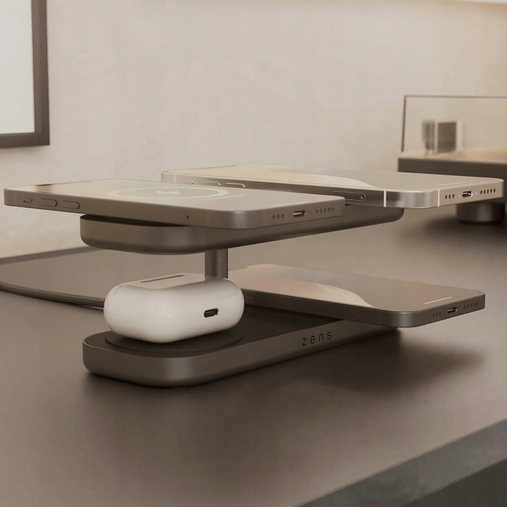Pożegnaj się z plątaniną kabli i zajmującymi miejsce ładowarkami. ZENS Quattro Wireless Charger Pro 4 eliminuje bałagan, pozwalając ładować wszystkie urządzenia w jednym, uporządkowanym miejscu. Jej smukła i elegancka konstrukcja świetnie komponuje się z każdym nowoczesnym wnętrzem – od kuchni po biuro.