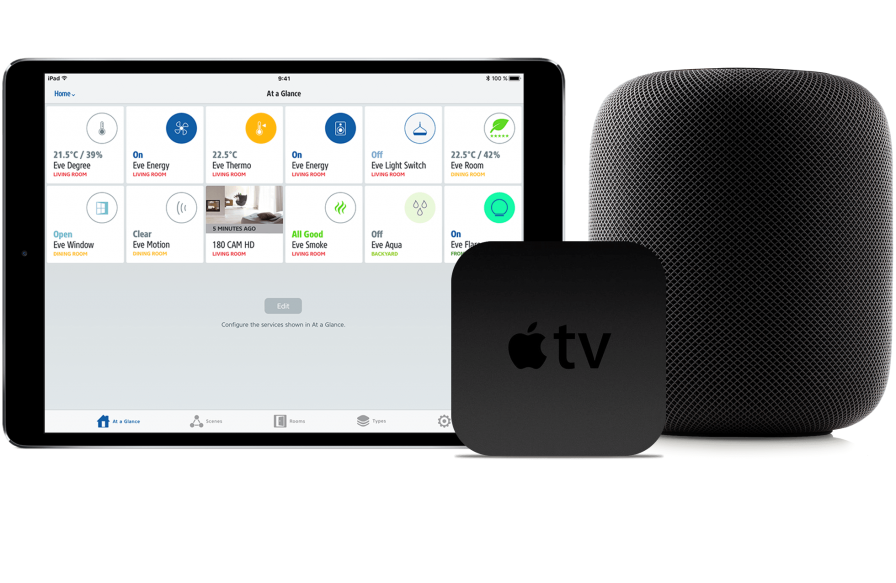 Akcesoria Eve są gotowe do współpracy z iPhonem, iPadem, iPodem touch i Apple Watch, natychmiast po wyjęciu z pudełka. Jako centralkę umożliwiającą dostęp do wszystkich urządzeń, kiedy jesteś poza domem możesz wykorzystać jedno z Twoich urządzeń Apple: HomePod, Apple TV lub iPad.