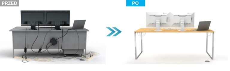 Zamiast prowadzić długie kable między komputerem i każdym monitorem z osobna, skorzystaj z połączeń szeregowych i krótkich kabli, aby podłączyć monitory między sobą, tworząc swoisty łańcuch wyświetlaczy. W ten sposób ograniczysz liczbę plątających się po biurku i podłodze przewodów.