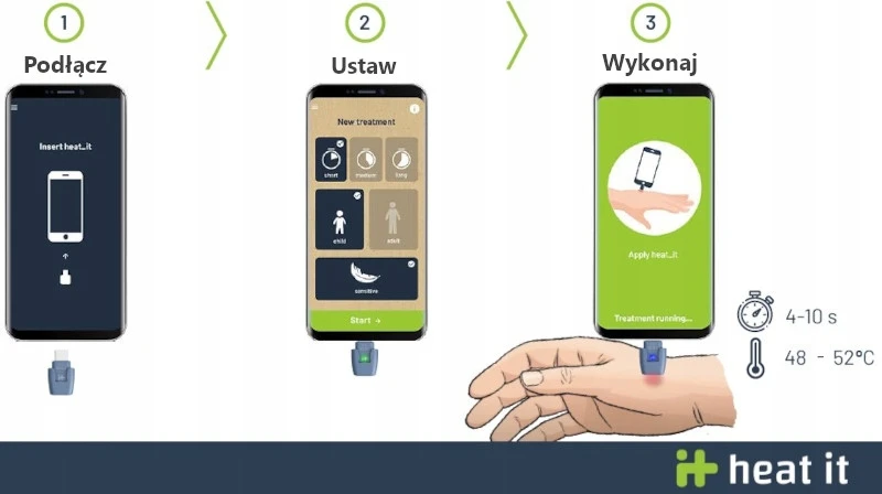 Heat_it to innowacyjne urządzenie medyczne wykorzystujące zjawisko punktowej "hipertermii" do łagodzenia świądu i bólu wywołanego ukąszeniami owadów. Wystarczy podłączyć Heat_it do smartfona, uruchomić specjalną aplikację i przyłożyć na kilka sekund do skóry. Działanie jest niemal natychmiastowe, zwłaszcza gdy użyjemy urządzenia bezpośrednio po ukąszeniu lub użądleniu. Użycie w późniejszym czasie również przyspiesza ustąpienie objawów.